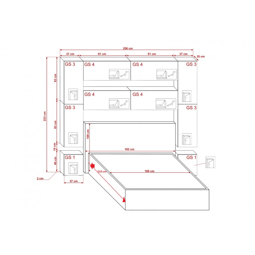 El conjunto incluye : estructura mural formada por 8 armarios. Incluye 2 mesitas de noche