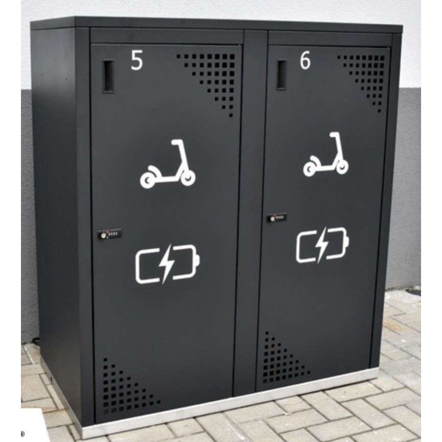 Le coffre pour trottinettes électriques à deux places Krosbox II combine design robuste et praticité. Chaque utilisateur bénéficie d’un espace individuel avec une prise de recharge protégée et un support pour le chargeur. Sa structure en acier inoxydable assure une résistance à long terme, même dans les environnements humides.