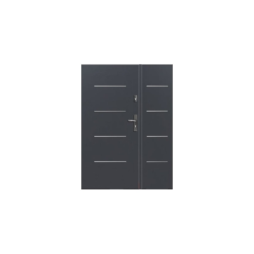 Porta esterna di 56 mm di spessore in acciaio inox. Lastruttura è riempita con un pannello di poliuretano espanso e legno con ottime proprietà isolanti e acustiche.