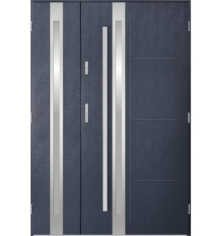 Porte extérieure de 55 mm d'épaisseur composée d’acier inoxydable. La structure est remplie d'une plaque de mousse polyuréthane et de bois possédant de très bonnes propriétés isolantes et acoustiques.